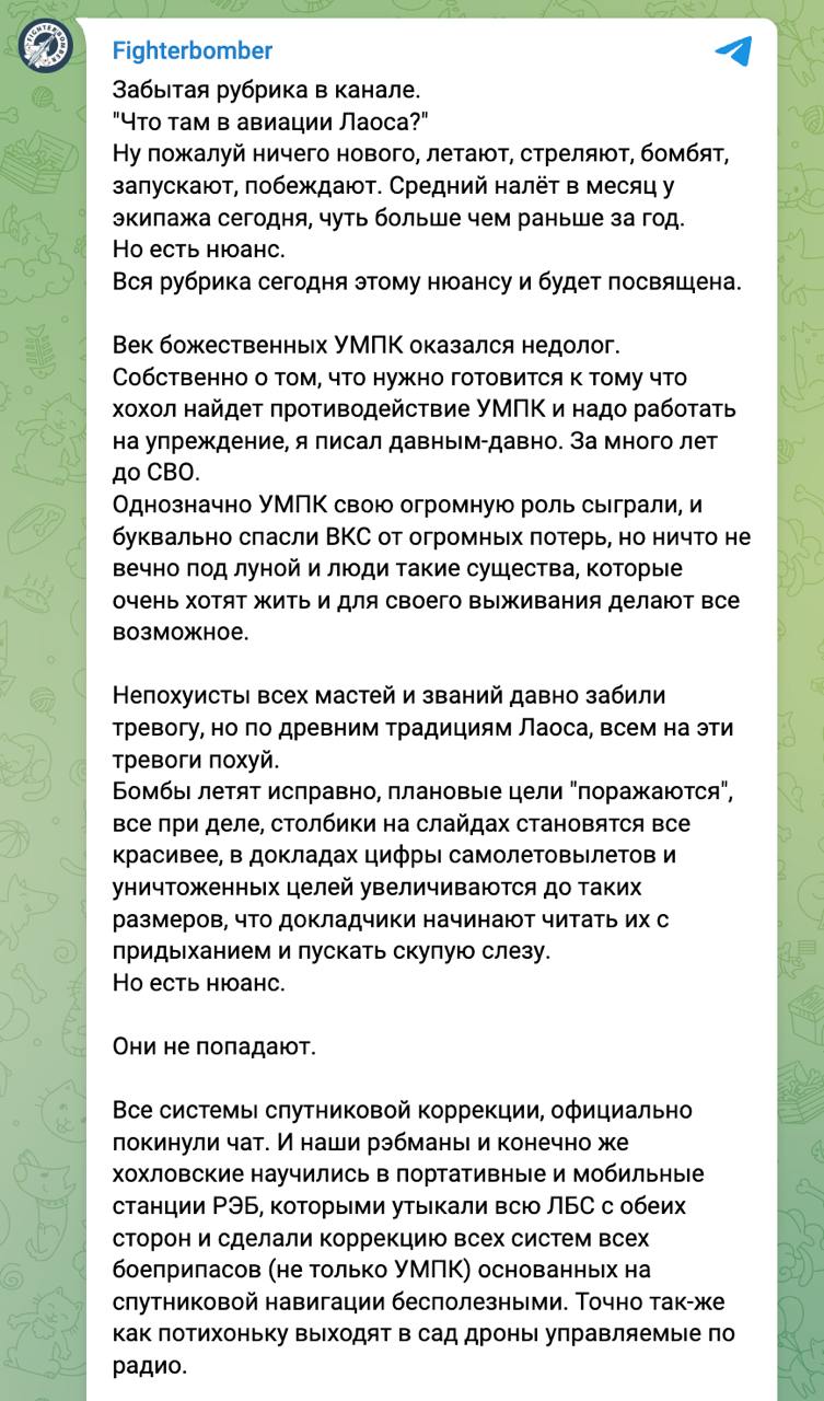 За його даними, УМПК (уніфікований модуль планування та корекції) більше "не потрапляють", тому що ЗСУ навчилися збивати їхню супутникову корекцію за допомогою РЕБ, якими "утикана" вся лінія фронту.