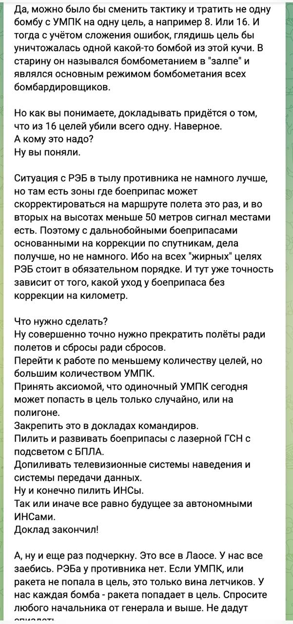 Тому ефективно потрапляти вони зараз можуть лише з великими цілями в тилу, на кшталт "заводів, фабрик, міст". Телеграм-канал пише, що тепер потрапити до менш масштабної мети можна лише, випускаючи на неї не одну, а кілька бомб.