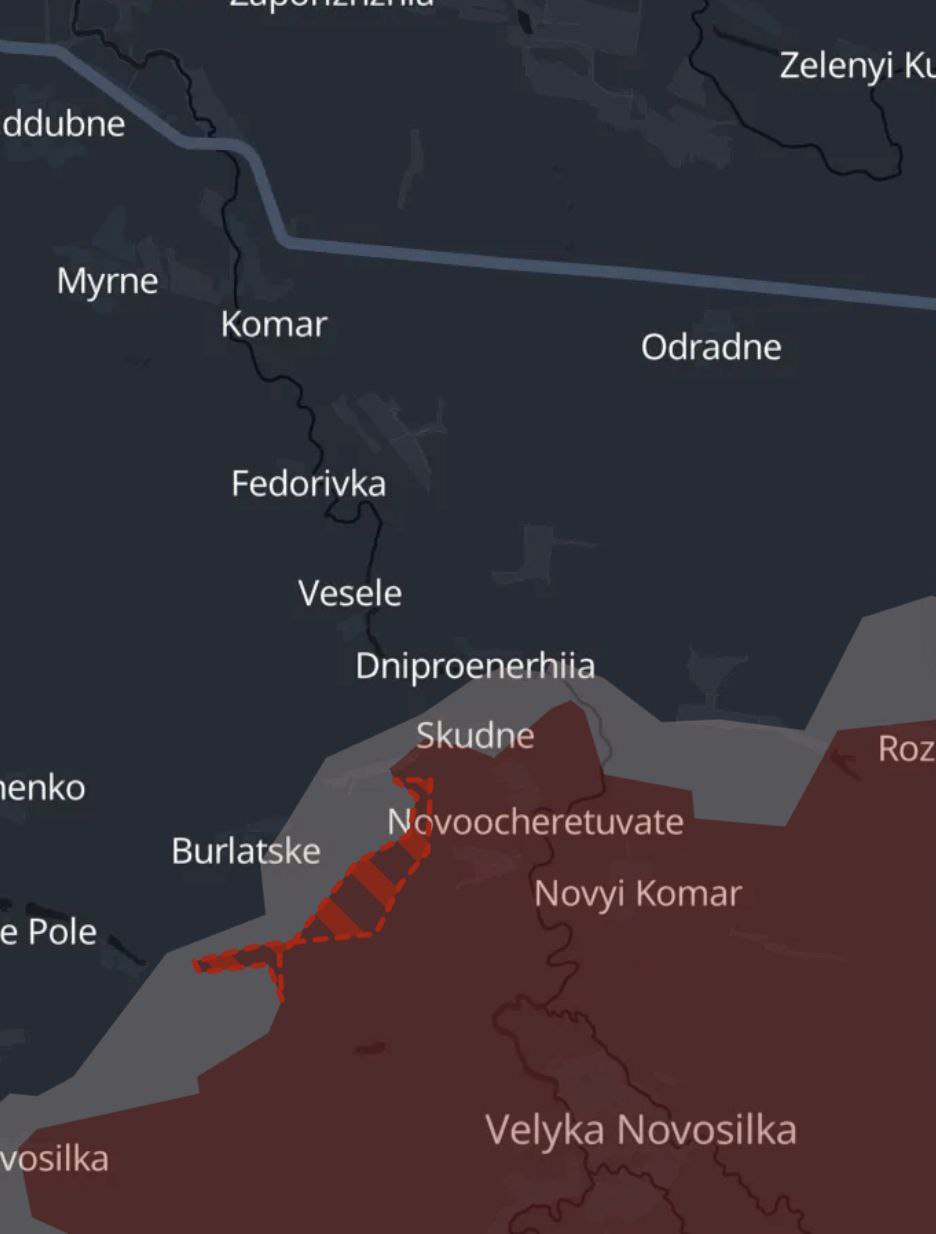 07:55 Російські війська минулої доби просунулися з боку Великої Новосілки (район Бурлацького) та в Андріївці на захід від Курахового.