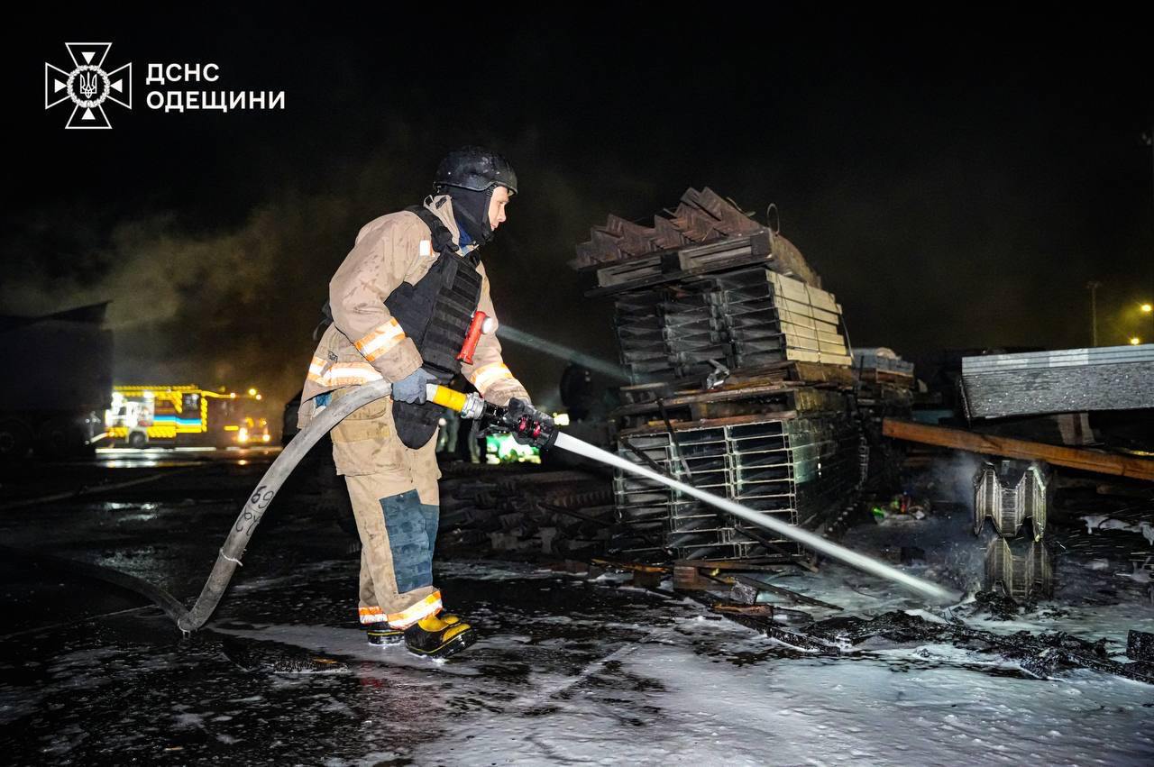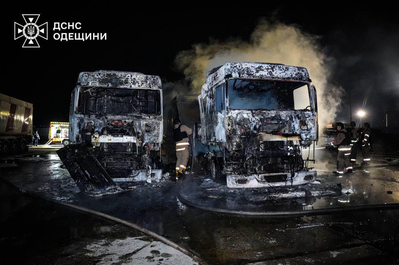 08:35 На Одещині після атаки дронів горіло підприємство, знищено вантажні автомобілі, повідомляє ДержНС.