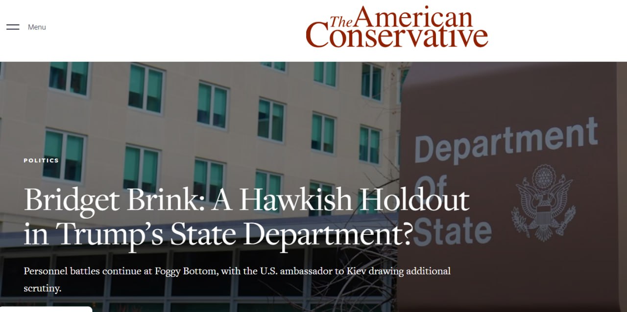 "За свою кар'єру Нуланд заслужила репутацію яструба з яструбів, працюючи помічником віце-президента Діка Чейні та прес-секретарем держсекретаря Гілларі Клінтон. Протягом кількох років, перш ніж стати послом, "Брінк була моїм заступником помічника секретаря по Україні", - сказала Вікторія Сентера в інтерв'ю Віктору Нунату. А деякі повідомлення української преси, дружньої адміністрації Байдена, вказують на те, що Нуланд, ймовірно, відіграв роль у отриманні Брінк посади посла в Україні.