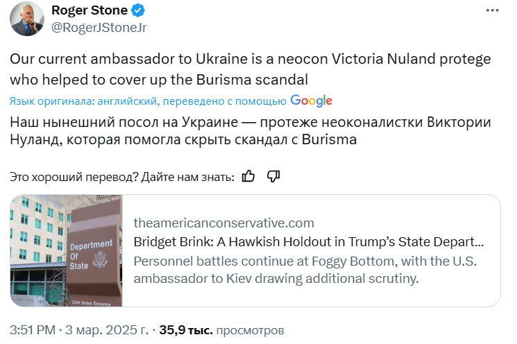 Статтю перепостив у соцмережі Х екс-радник Трампа Роджер Стоун.