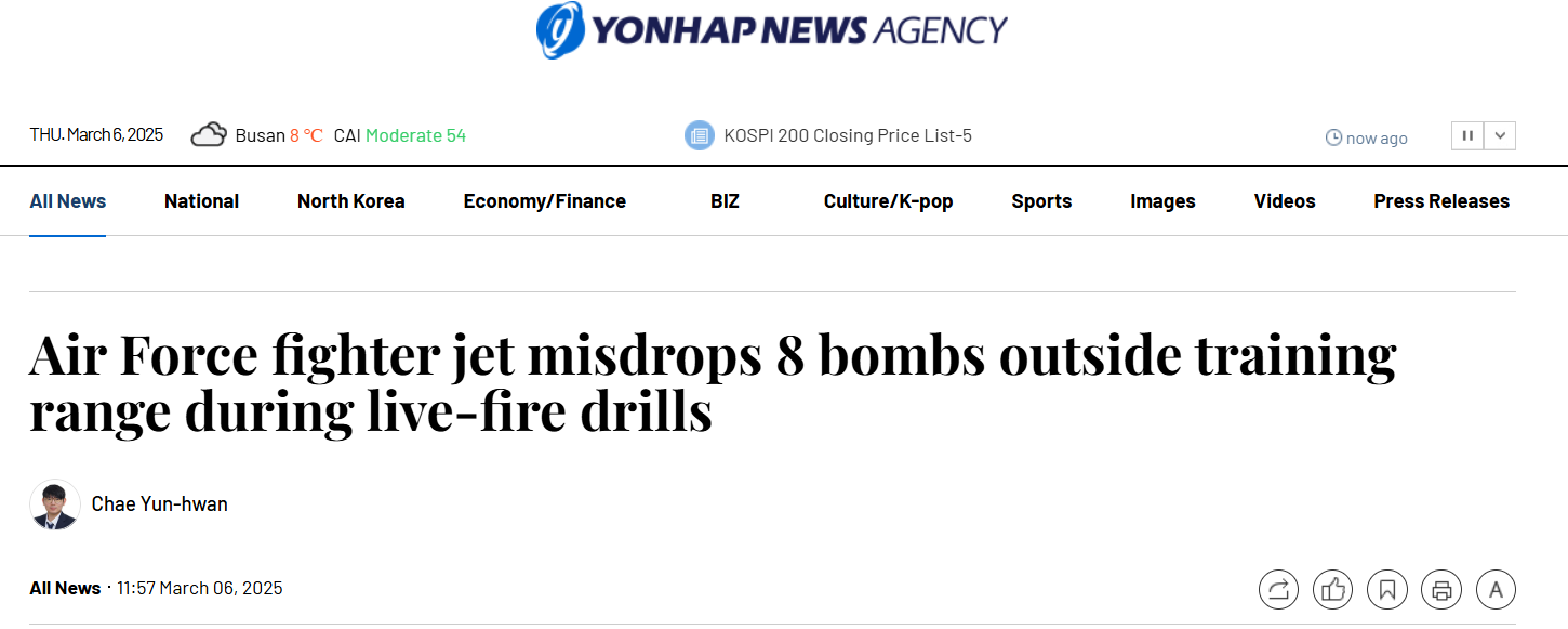 "Винищувач KF-16, який брав участь у навчаннях із бойовою стрільбою, "нештатно" скинув вісім бомб MK-82 за межами полігону в Пхочоні, за 42 кілометри на північний схід від Сеула, о 10:04 ранку", - йдеться у статті.