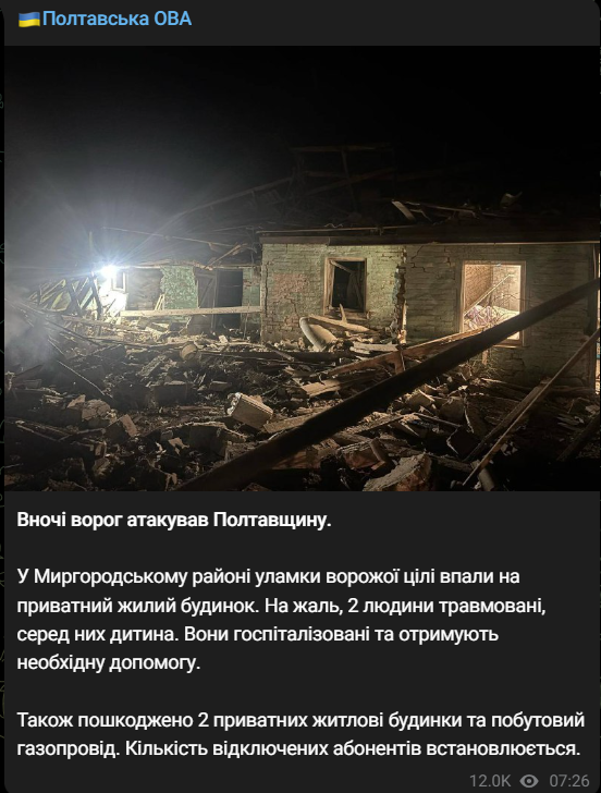 Також були повідомлення про прильоти газової інфраструктури в Полтавській області. У Миргородському районі уламки ворожої мети впали на приватний житловий будинок. На жаль, 2 людей травмовано, серед них дитина.