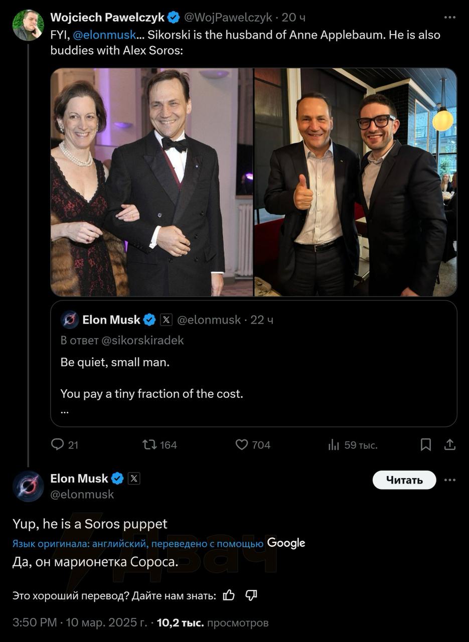Нагадаємо, між головою DOGE Маском, державним секретарем США Марко Рубіо та міністром закордонних справ Польщі Сікорським сталася суперечка з приводу надання супутникового інтернету Starlink для України. Після цього публічного конфлікту з командою Трампа членам польського уряду роздали інструкції із рекомендацією "обережно" коментувати заяви американських політиків, пише Onet. При цьому Варшава не вважає помилковим вступ Сікорського до суперечки з американцями.
