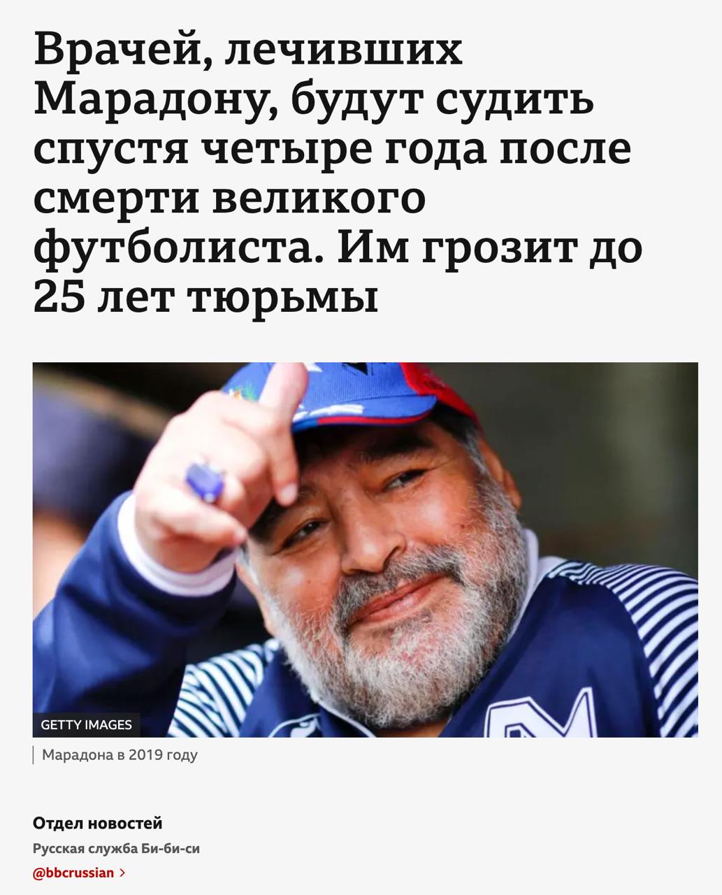 Дієго Марадона помер у віці 60 років. На початку листопада 2020 року він був госпіталізований із крововиливом у мозок, 11 листопада його виписали. 25 листопада у колишнього футболіста стався серцевий напад. За даними адвоката Марадони, він і став причиною смерті спортсмена.