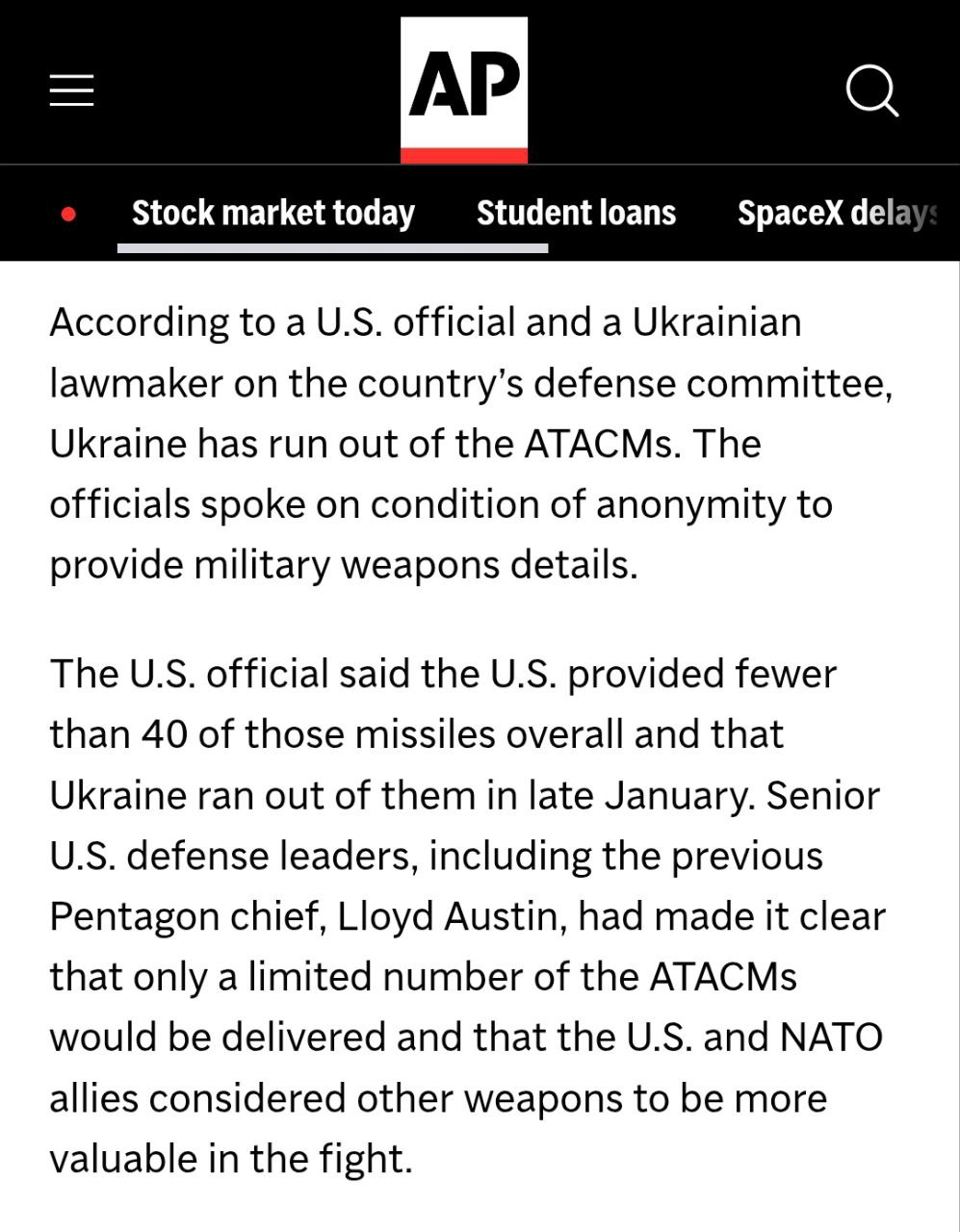 "Американський чиновник заявив, що США поставили менш як 40 таких ракет загалом і що вони закінчилися в України наприкінці січня", - повідомляє агентство.