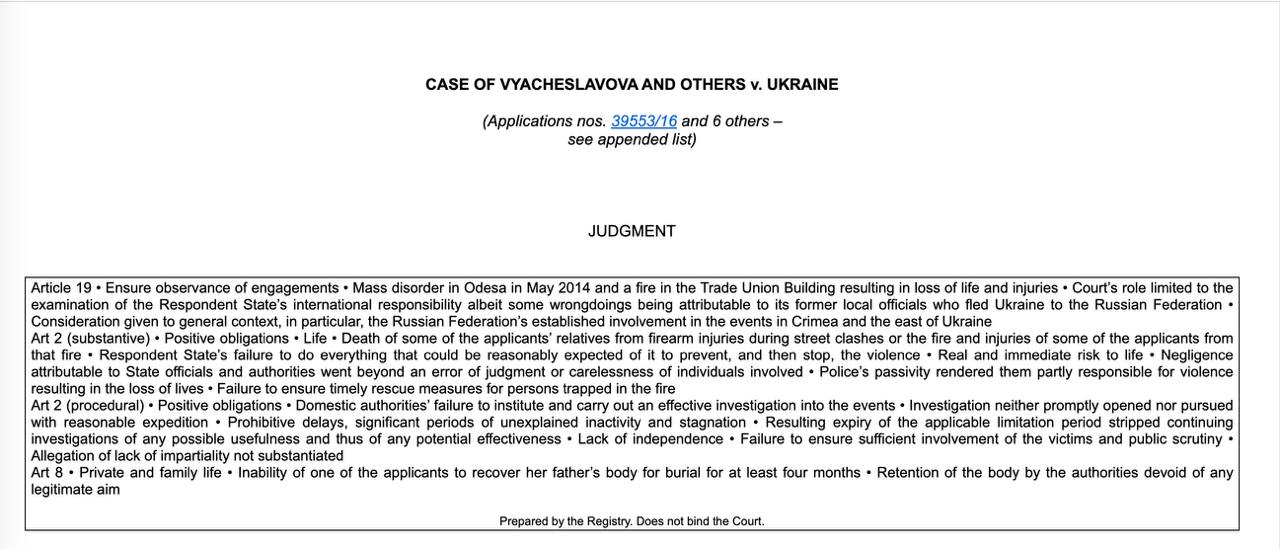 Суд дійшов висновку, що одеська поліція "не зробила практично нічого", щоб запобігти нападу на мітингувальників, проігнорувала численні оперативні дані про підготовку заворушень, "відправлення пожежних машин на місце пожежі було навмисно затримано на 40 хвилин, а поліція не втрутилася, щоб допомогти евакуювати людей".