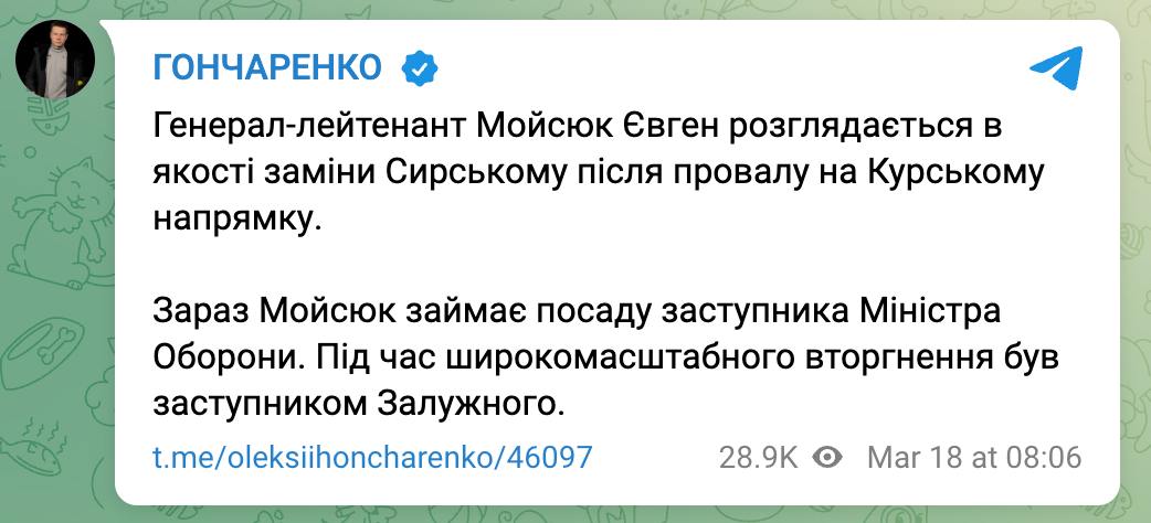 "Генерал-лейтенант Мойсюк Євген розглядається як заміну Сирському після провалу на Курському напрямку", - пише Гончаренко.