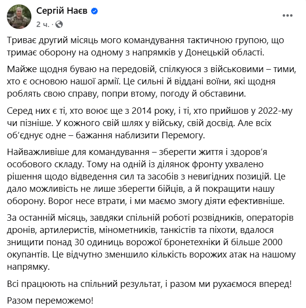 "Найважливіше для командування - зберегти життя та здоров'я особового складу. Тому на одній із ділянок фронту прийнято рішення про відведення сил та засобів з невигідних позицій. Це дозволило не лише зберегти бійців, але й покращити нашу оборону. Ворог зазнає втрат, і ми маємо можливість діяти ефективніше", - пише Наєв на своїй сторінці в Facebook.