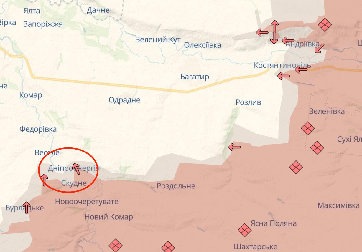 Карта Deep State показує, що ЗСУ тут останніми днями поступово відходили в районі Скудного. Росіяни вже підходять до Веселого.