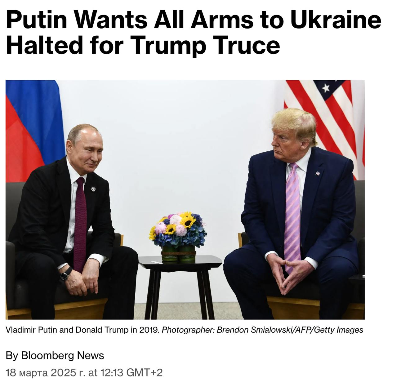 При цьому Путін вимагає зупинити постачання тимчасово і не проти, щоб вони відновилися після укладання мирної угоди, але в якій Україна має погодитись на обмеження свого військового потенціалу.