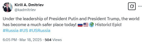 "Під керівництвом президента Путіна і президента Трампа світ сьогодні став набагато безпечнішим. Історично! Епічно!" - Заявив Дмитрієв.