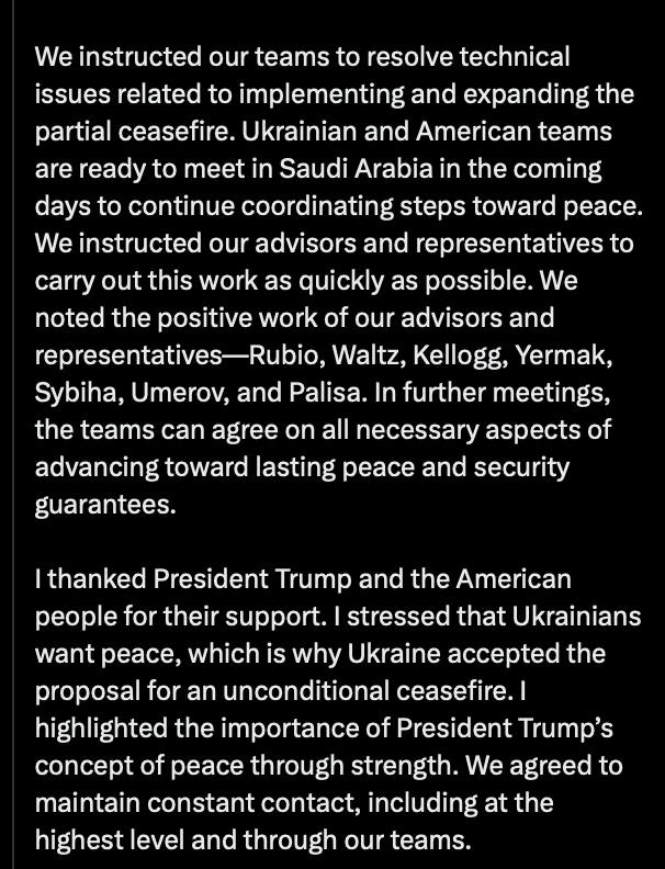 Ми доручили нашим командам вирішити технічні питання, пов'язані з реалізацією та розширенням часткового припинення вогню. Українська та американська команди готові зустрітися у Саудівській Аравії найближчими днями для продовження координації кроків щодо досягнення миру. Ми доручили нашим радникам та представникам провести цю роботу якнайшвидше. Ми відзначили позитивну роботу наших радників та представників — Рубіо, Уолтца, Келлога, Єрмака, Сібіги, Умерова та Паліси. На подальших зустрічах команди можуть домовитися про всі необхідні аспекти просування до міцного світу та гарантій безпеки.