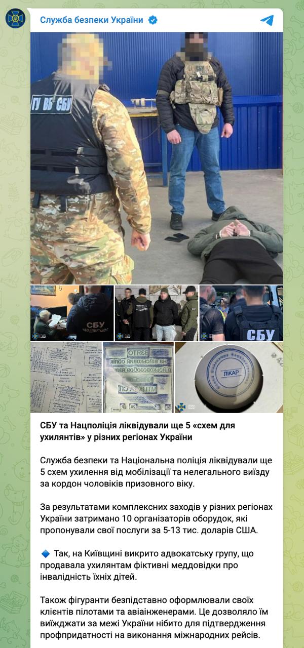 Як повідомляє СБУ, на Київщині адвокатська група продавала чоловікам фіктивні медичні довідки про інвалідність їхніх дітей, а також оформляла їх пілотами та авіаінженерами. Це дозволяло чоловікам виїжджати за кордон для підтвердження профпридатності на виконання міжнародних рейсів та не повертатись назад.