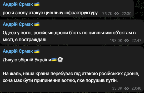Нагадаємо, глава Офісу президента Андрій Єрмак сьогодні сказав, що "Росія знову атакує громадянську інфраструктуру" - коментуючи вчорашні удари по Одесі.