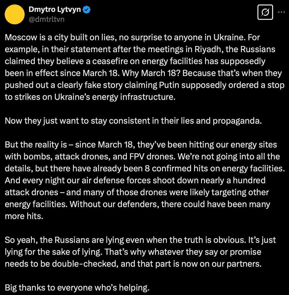 12.18 Радник Зеленського Дмитро Литвин заявляє, що з 18 березня, коли Путін повідомив про наказ припинити удари по українській енергетиці, Росія завдала 8 таких ударів.