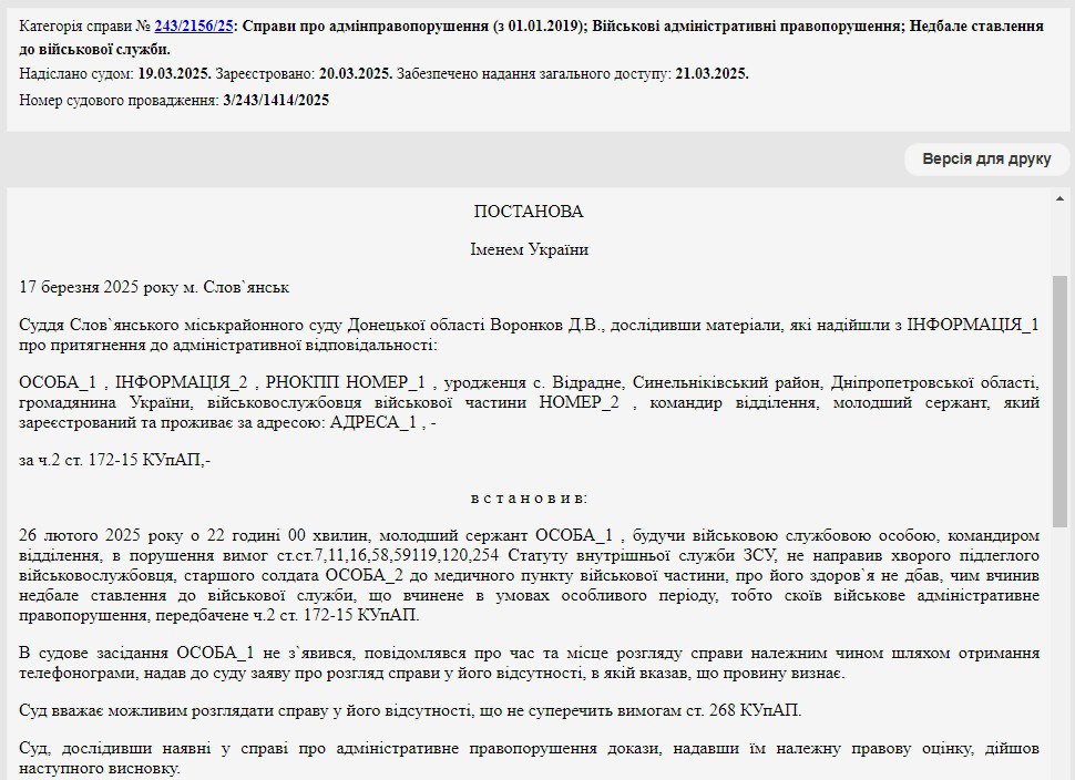 У результаті молодшого сержанта визнали винним в адміністративному правопорушенні за ч. 2 ст. 172-15 (недбале ставлення до військової служби в умовах особливого періоду) Кодексу про адміністративні правопорушення та оштрафували.