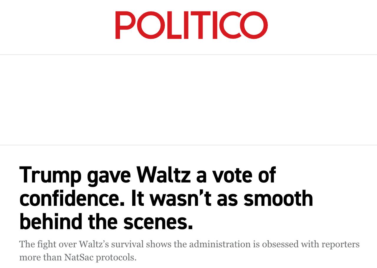 Як пише Politico, скандал із листуванням у чаті загострив відносини Уолтца з найближчим оточенням Трампа і що в адміністрації дуже підозріло ставляться до співробітників, які контактують із журналістами не зони відповідальності. В одного співробітника, якого запідозрили у витоку, навіть перевіряли телефон щодо спілкування з репортером. Також іноді адміністрація спеціально поширювала неправдиві чутки, щоби перевірити, хто може їх злити.