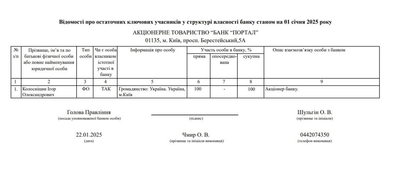 Станом на 1 січня 2025 року у банку "Портал", за інформацією НБУ, був один власник - це киянин Ігор Колосніцин, який володів 100% акцій структури. Йому також належало шість інших компаній: від ТОВ "УК-Інвест" (нерухомість) та ТОВ "ТОП Авто Сервіс" (автосервіс, торгівля авто) до ТОВ "Агроконтракт" (оптова торгівля).