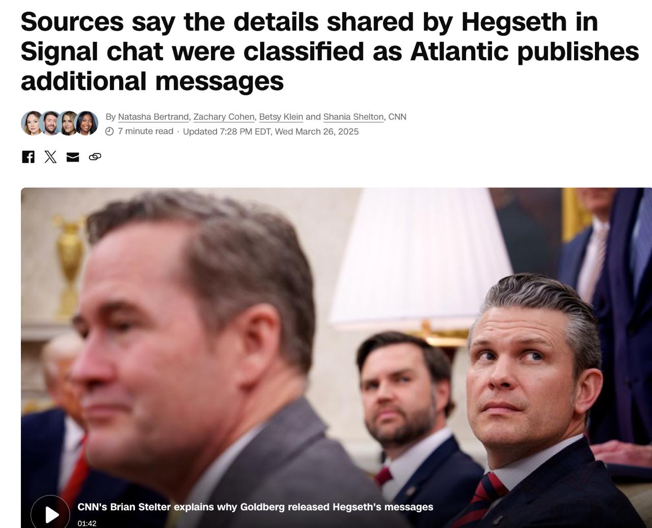 Причому військові джерела CNN вважають, що інформація, яку Хегсет розкрив у чаті Signal, "була суворо засекречена на момент її написання - тому, що операція (ударів по хуситах - Ред.) ще навіть не почалася".