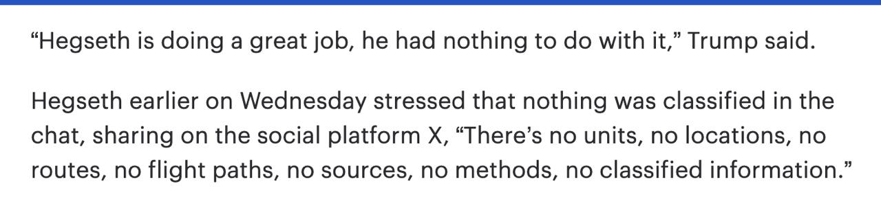 "Хегсет чудово виконує свою роботу, він не має до цього жодного відношення", - сказав Трамп.