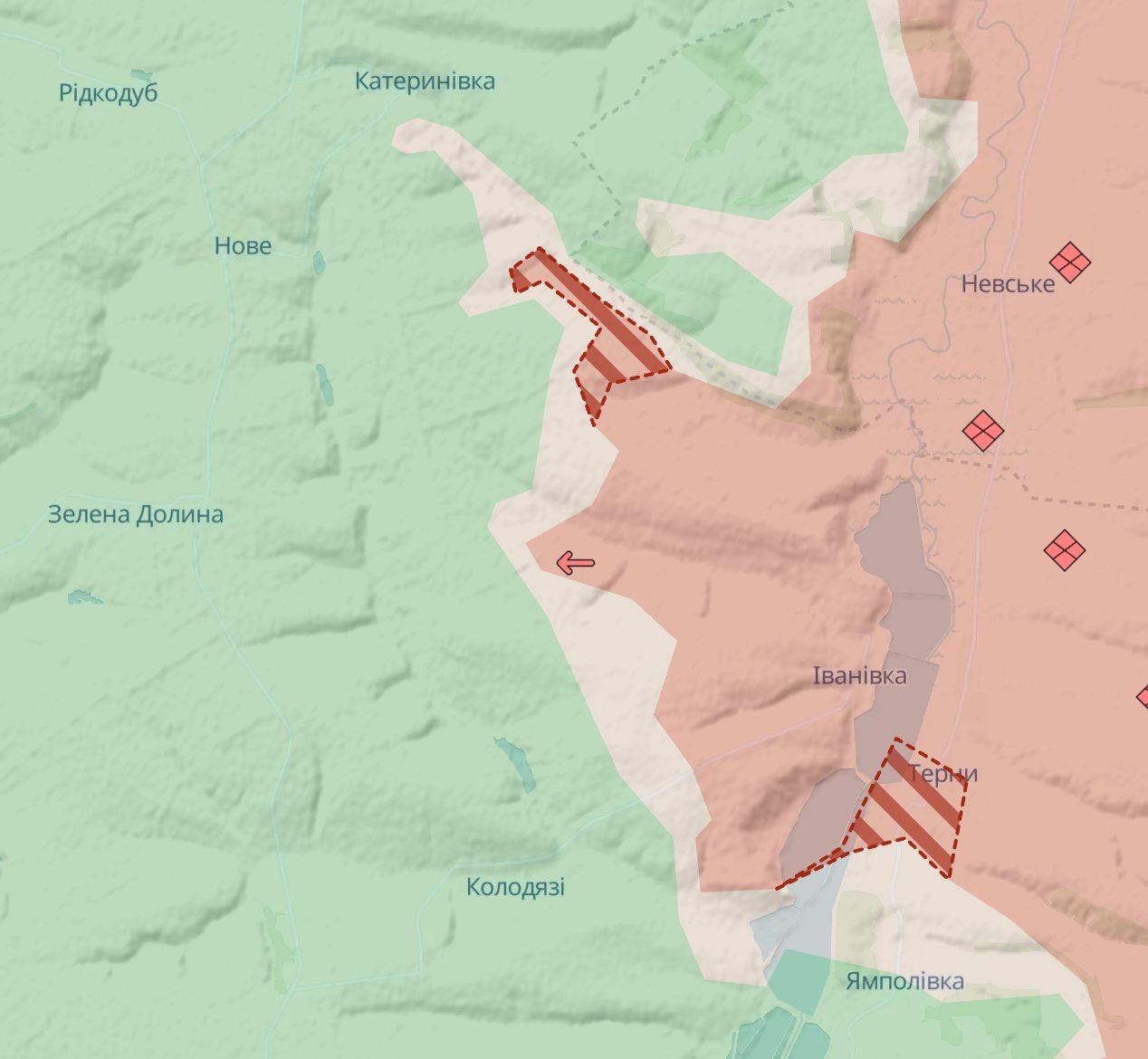 Також армія РФ просунулася на лиманському напрямку, майже повністю захопивши Терни і впритул підібралася до Катеринівки, повідомляє Deep State.