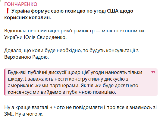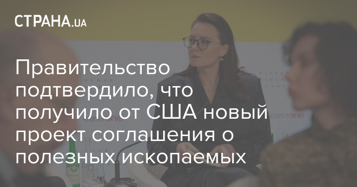 Уряд України підтвердив, що отримав від США новий проєкт угоди про корисні копалини. Про це повідомив народний депутат Олексій Гончаренко із посиланням на виступ у парламенті віце-прем'єра Юлії Свириденко.