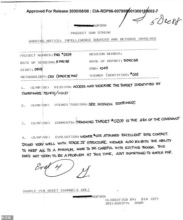 Як описано у звіті розвідуправління від 5 грудня 1988 року, перед одним із медіумів за №032 поставили завдання знайти "певний предмет", але не пояснили йому, що це ковчег Завіту. Екстрасенс описав ковчег Завіту як скриню, виготовлену з дерева, золота та срібла, із зображеннями шести крилатих ангелів. За його словами, він "десь на Близькому Сході".