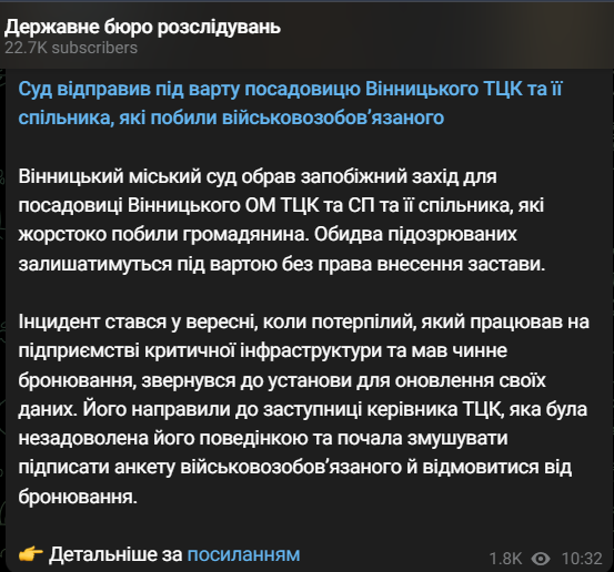 "Вінницький міський суд обрав запобіжний захід для посадової особи Вінницького ОМ ТЦК та СП та її спільника, які жорстоко побили громадянина. Обидва підозрювані залишатимуться під вартою без права внесення застави", - йдеться у повідомленні.