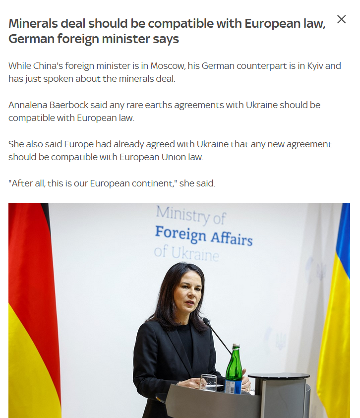 Бербок сказала, що Брюссель раніше вже домовився з Києвом, що будь-яка нова угода про рідкісні землі повинна відповідати праву Євросоюзу, оскільки Україна йде до членства в блоці.
