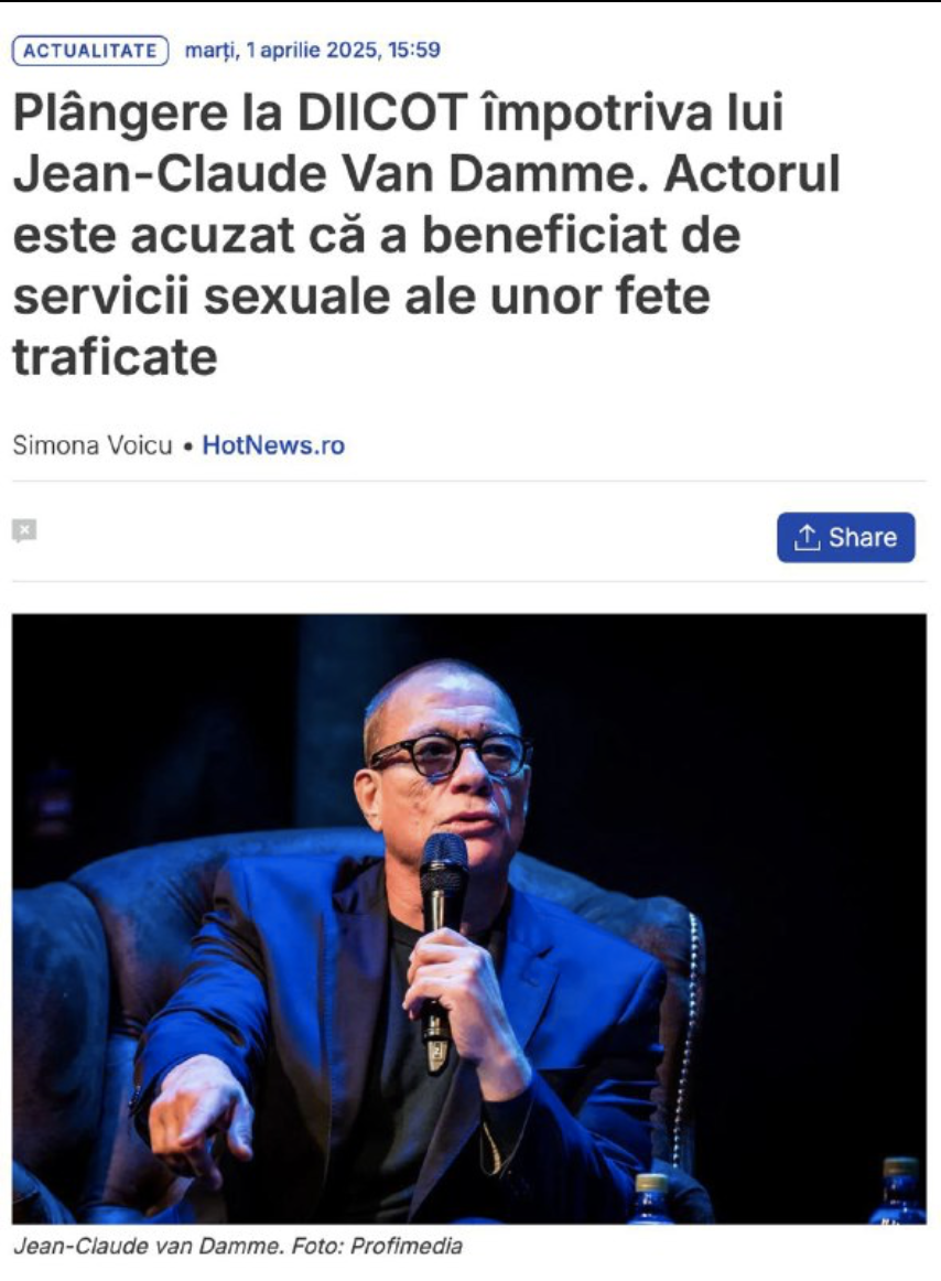 Американський актор Жан-Клод Ван Дамм став фігурантом кримінальної справи про торгівлю людьми в Румунії, зокрема, неповнолітніми. Справу розслідує підрозділ прокуратури Румунії з боротьби з організованою злочинністю (DIICOT) у місті Ясса.