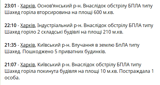 Заявляється, що удари безпілотниками завдавалися по Київському, Індустріальному та Основ'янському районам міста.