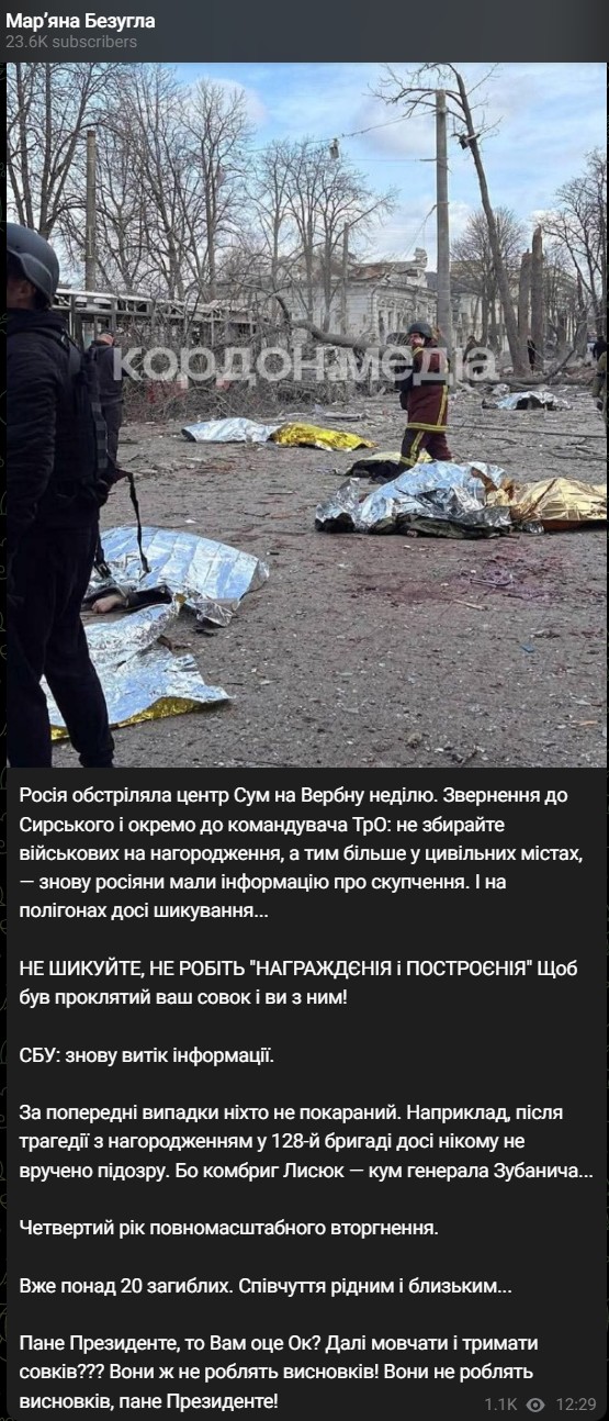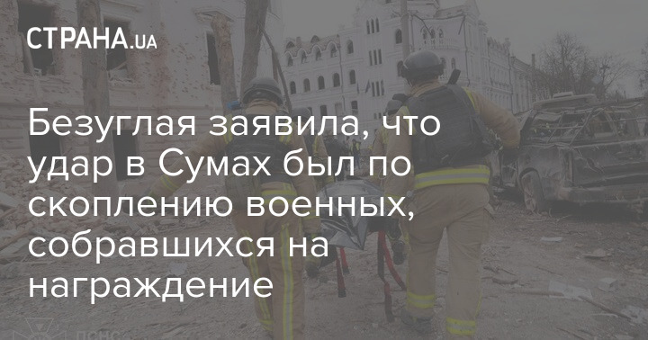 Народний депутат Мар'яна Безугла пише, що приліт у Сумах був по скупченню військових, які проводили урочисте нагородження.