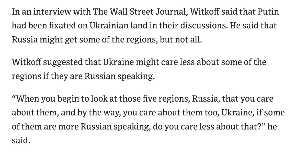 При цьому він заявляє, що Україні можуть бути "менш важливими" її російськомовні регіони, пише The Wall Street Journal з посиланням на коментар Віткоффа.