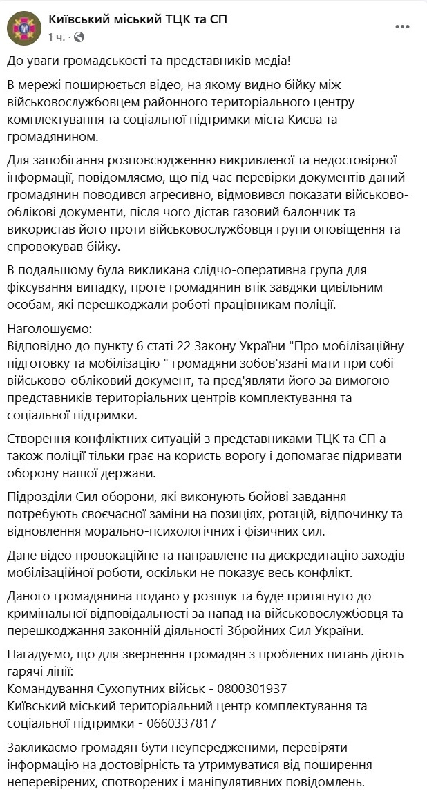 Заявляють, що чоловік "поводився агресивно, відмовився показати військово-облікові документи, дістав газовий балончик і використав його проти військовослужбовця і спровокував бійку".