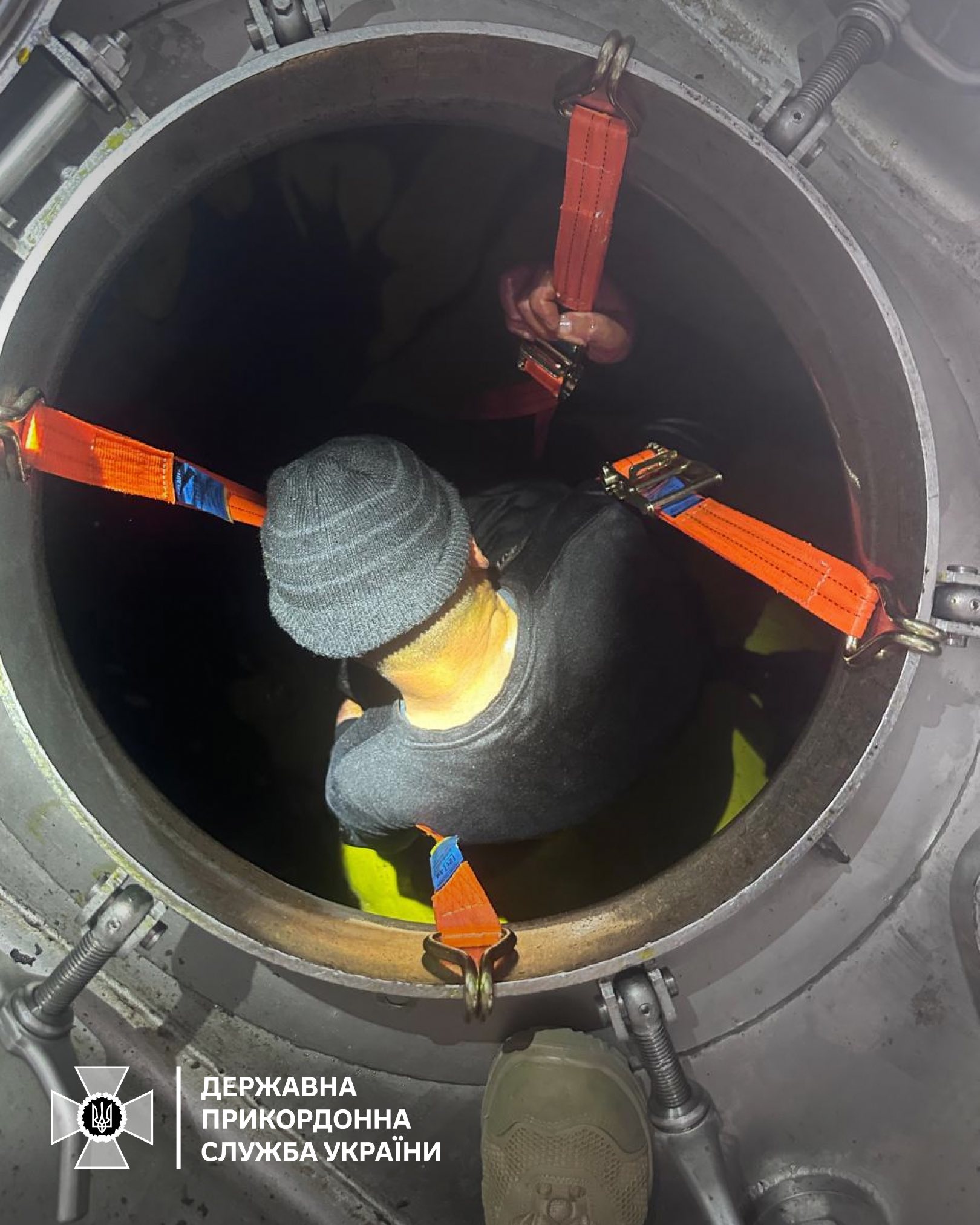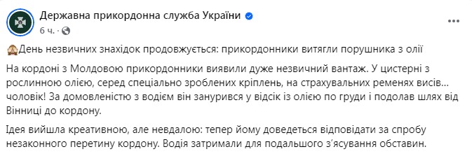 Чоловік висів у цистерні на спеціально зроблених кріпленнях та страхувальних ременях. Як виявилося, за домовленістю з водієм він поринув у відсік з олією по груди та пройшов шлях від Вінниці до кордону.