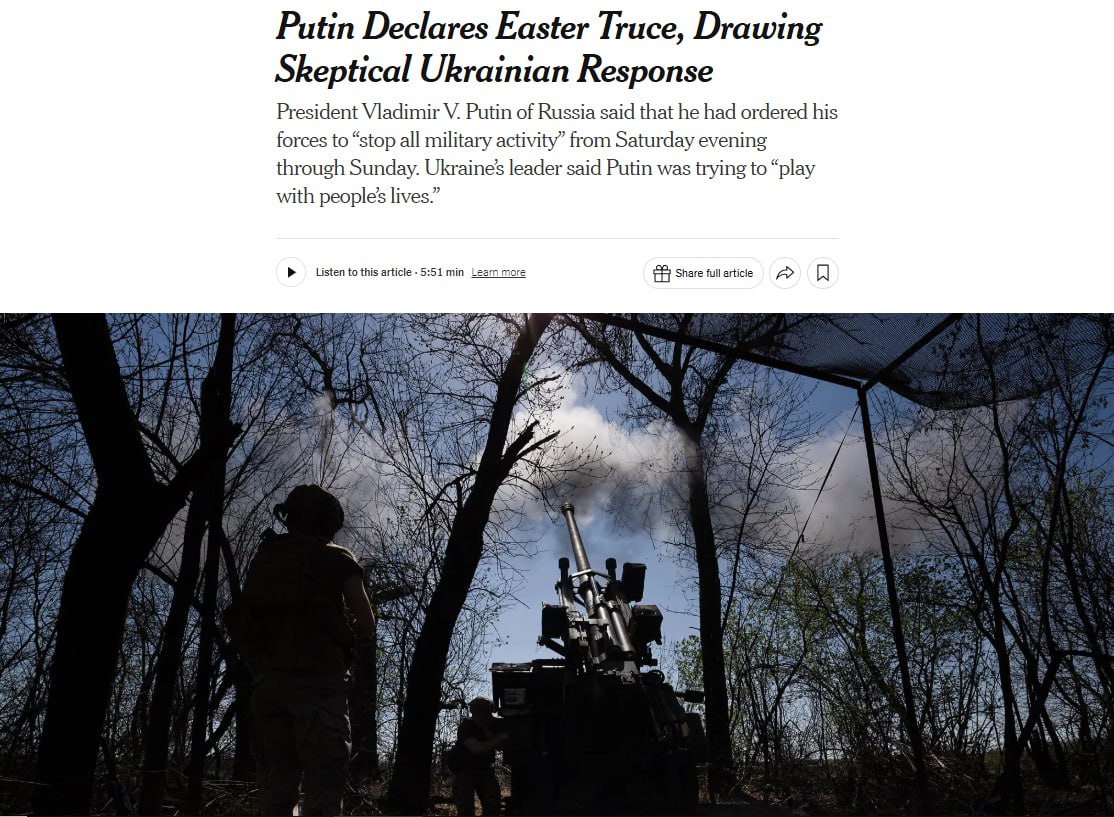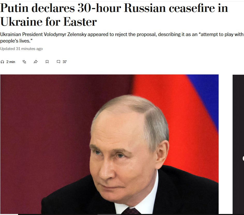 "Російський лідер заявив, що очікує, що Україна наслідуватиме приклад Росії, і додав, що реакція Києва покаже, наскільки серйозно він прагне мирного врегулювання війни. Президент України Володимир Зеленський, судячи з усього, відкинув цю пропозицію в суботу, назвавши її "спробою грати життям людей", – повідомляє видання.