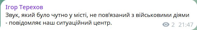 21:51 Звук вибуху у Харкові не був пов'язаний із бойовими діями, повідомив мер міста Терехов.