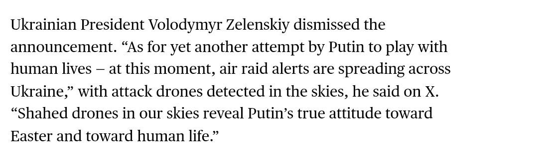 "Російський лідер заявив, що очікує, що Україна наслідуватиме приклад Росії, і додав, що реакція Києва покаже, наскільки серйозно він прагне мирного врегулювання війни. Президент України Володимир Зеленський, судячи з усього, відкинув цю пропозицію в суботу, назвавши її "спробою грати життям людей", – пише видання.