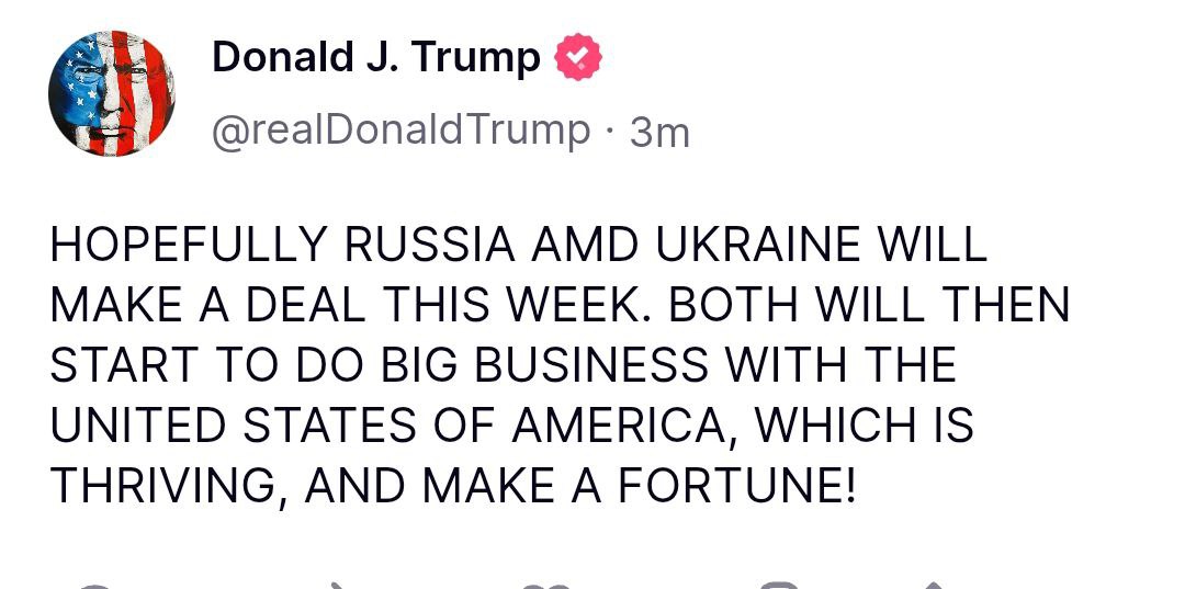 "Сподіваюся, Росія та Україна досягнуть угоди цього тижня. Тоді обидві сторони почнуть вести великий бізнес із Сполученими Штатами Америки, які процвітають, і запрацюють", - заявив президент США.
