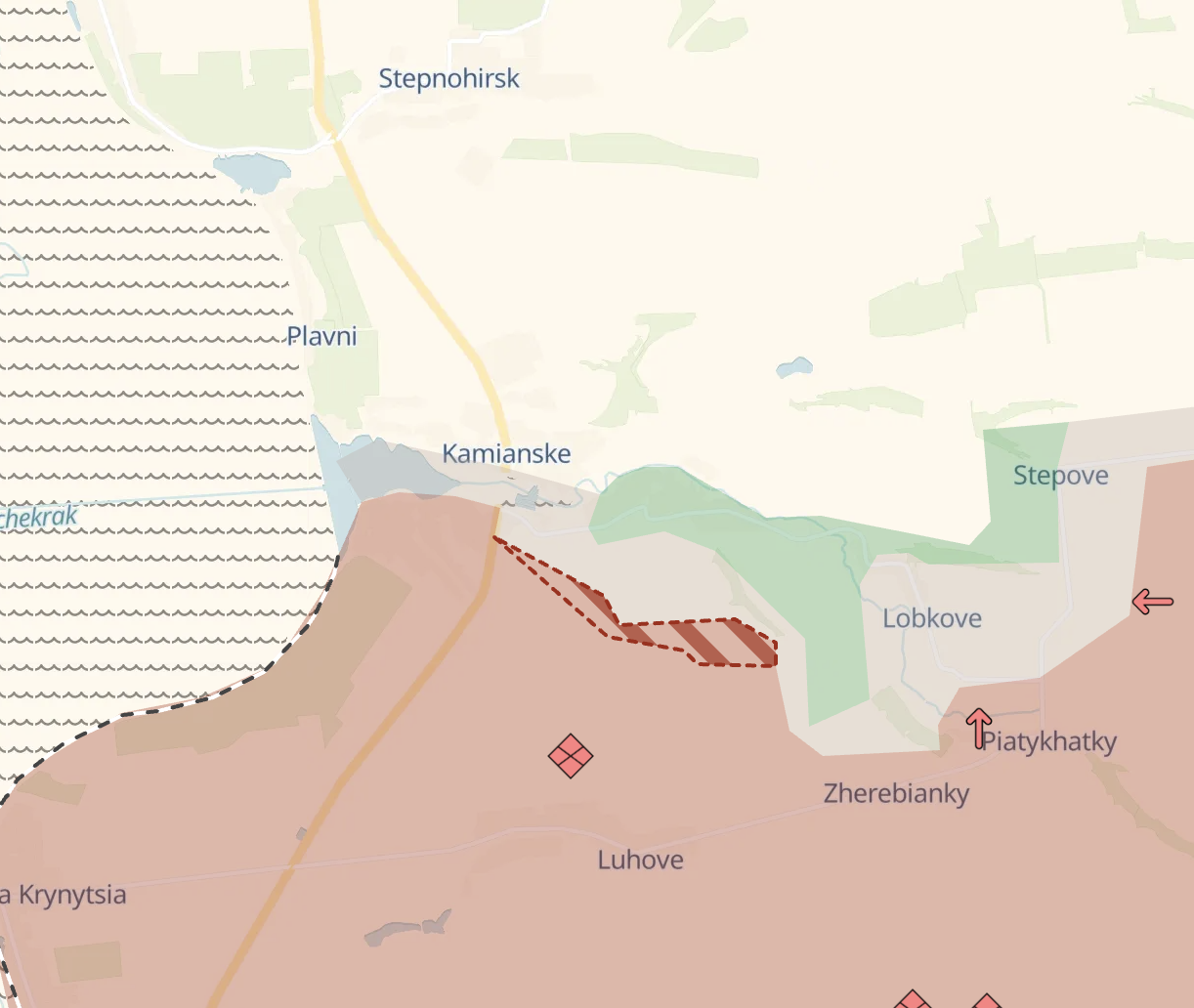 Армія РФ просунулася в районі Кам'янського Запорізької області та в Дніпроенергії (південний захід Донецької області), згідно з останнім зведенням українського військового паблику Deep State.