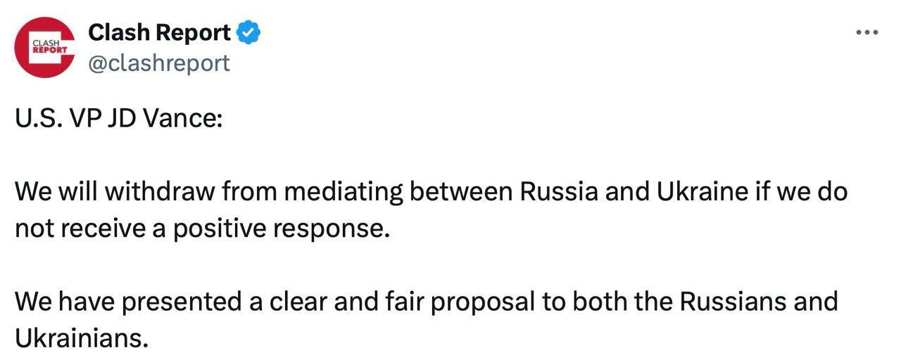 Віце-президент США Джей Ді Венс заявив, що Вашингтон відмовиться від посередництва між РФ та Україною, якщо не отримає позитивної відповіді. Очевидно, він має на увазі відповідь на американські умови встановлення миру, викладені в опублікованому ЗМІ плані врегулювання конфлікту.
