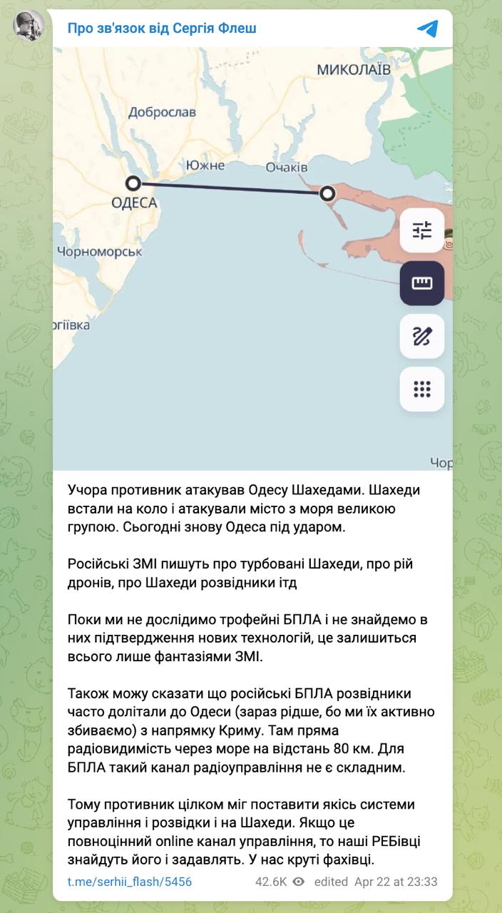 Про це заявив у своєму телеграм-каналі експерт зі зв'язку Сергій Бескрестнов із позивним Флеш, коментуючи останній масований наліт дронів на Одесу.