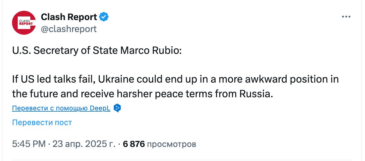 Про це заявив держсекретар США Марко Рубіо, повідомляє паблік Clash Repost.