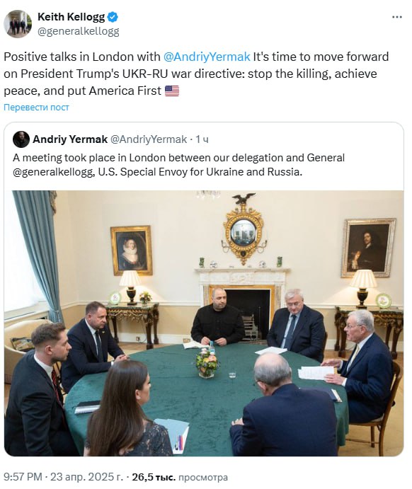 Відповідну посаду Келлог опублікував у соцмережі X, метнувши посаду голови Офісу президента Андрія Єрмака, в якому керівник української делегації в Лондоні повідомив про зустріч зі спецпредставником Трампа.