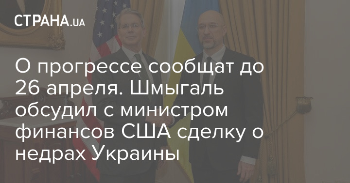 Прем'єр-міністр України Денис Шмигаль провів переговори щодо угоди про надра з міністром фінансів США Скоттом Бессантом та пообіцяв повідомити про "прогрес" до 26 квітня.