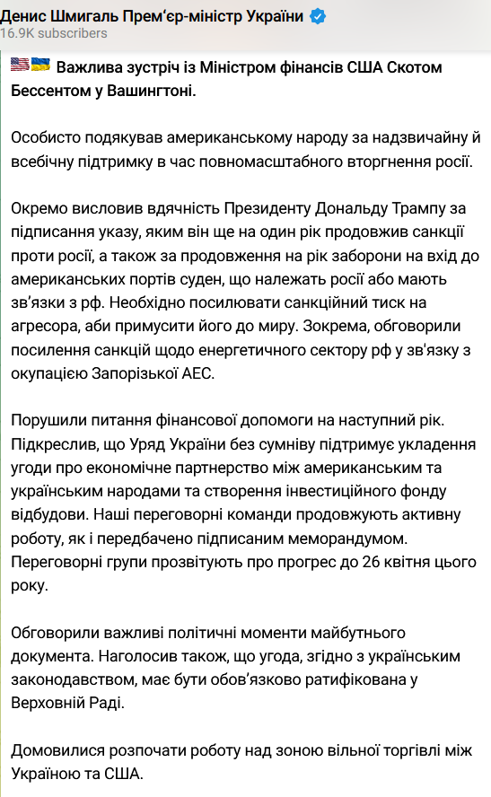Раніше Шмигаль повідомив, що разом з урядовою командою розпочинає роботу у Вашингтоні на Spring Meetings 2025 Світового банку та МВФ. Переговори щодо угоди про надра у своєму графіку прем'єр не згадував.