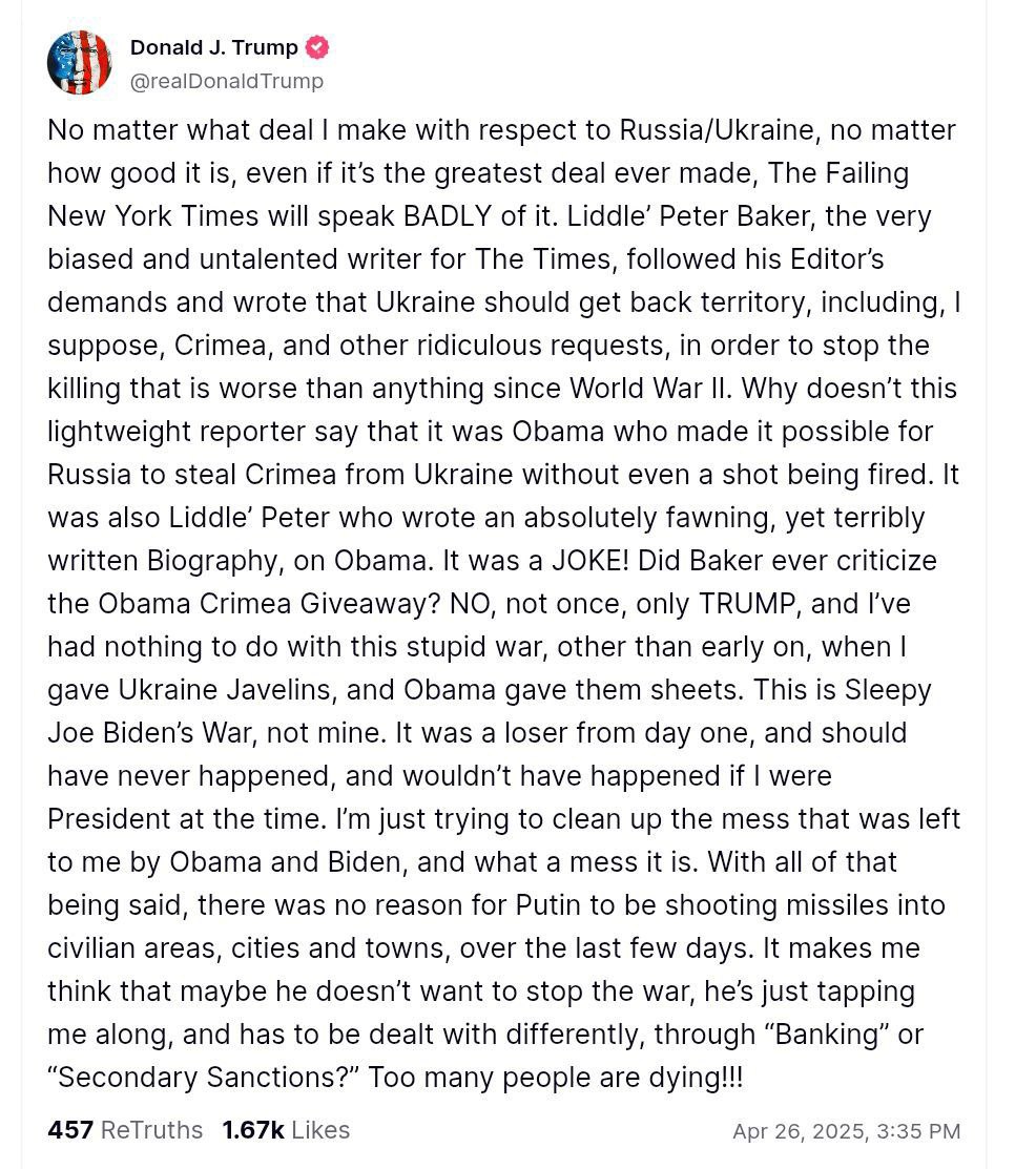 Ось що пише Трамп: "Неважливо, яку угоду я укладу щодо Росії та України, неважливо, наскільки вона буде гарною, навіть якщо це буде найкраща угода в історії, "Провальний New York Times" все одно відгукуватиметься про неї ПОГАНО. Маленький Пітер Бейкер, вкрай упереджений і бездарний письменник із The Times, виконав вказівку свого редактора і написав, що Україні слід повернути собі території, включаючи, як я розумію, Крим, і висунув інші безглузді вимоги, щоб зупинити бійню, що гірша з часів Другої світової війни. Чому ж цей легковажний репортер не пише про те, що саме Обама дозволив Росії захопити Крим в України без жодного пострілу? Саме Маленький Пітер написав абсолютно улесливу, але жахливо написану біографію Обами. Це був ЖАРТ! Чи критикував Бейкер колись "подарунок Криму" від Обами? ЖОДНОГО разу, тільки ТРАМПА, хоча я не мав жодного відношення до цієї дурної війни, крім того, що на самому початку я передав Україні "Джавеліни", тоді як Обама відправив їм тільки простирадла. Це війна Сонного Джо Байдена, а не моя. Це була програшна справа з самого першого дня, і її взагалі не мало статися - і не сталося б, якби я тоді був президентом. Зараз я просто намагаюся розібратися з тим бардаком, який мені залишили Обама і Байден, і який це жахливий бардак. І при всьому цьому немає жодного виправдання тому, що Путін останніми днями обстрілює ракетами цивільні об'єкти, міста та селища. Це змушує мене задуматися: може, він і не хоче припиняти війну, а просто водить мене за ніс, і з ним треба поводитися інакше, наприклад, через "банківські" чи "вторинні санкції"? Занадто багато людей гине!"