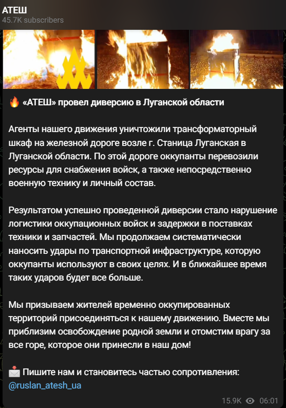 Партизани здійснили диверсію у Станиці Луганській. Фото: "АТЕШ"
